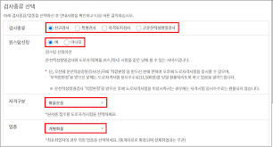 - 검사 종류 선택: 신규, 자격 유지, 특별 검사 중 해당되는 검사를 선택합니다.
