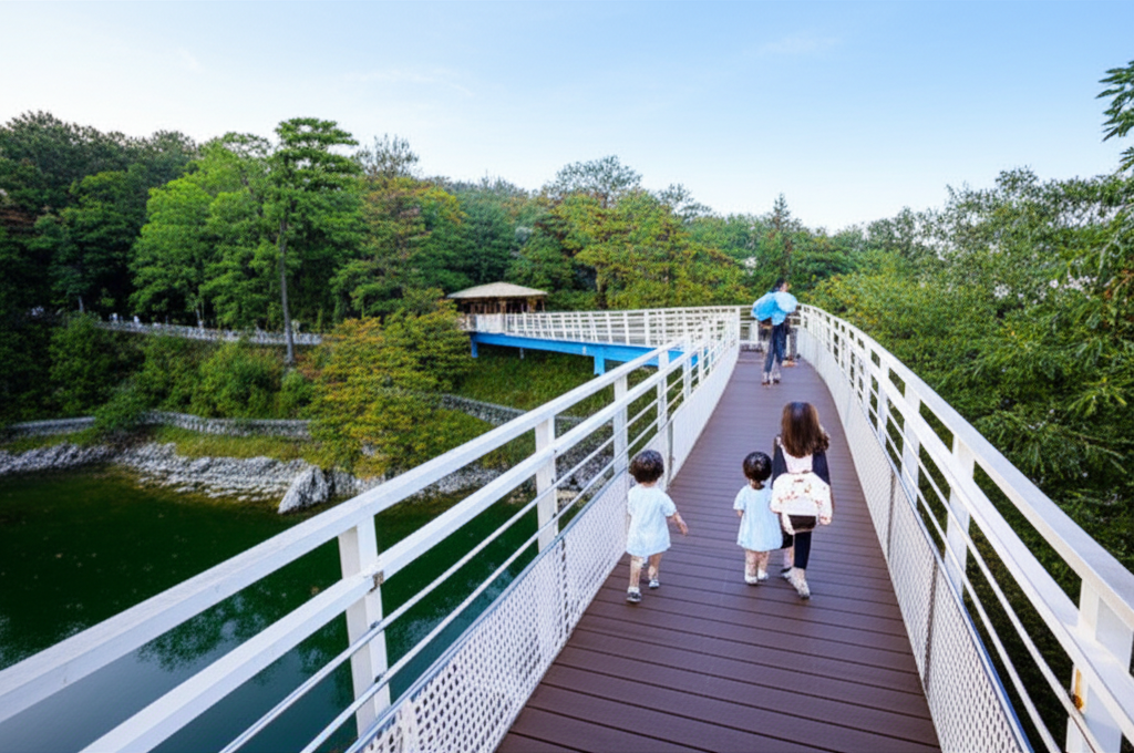 옥순봉 출렁다리는 청풍호반 수면 위에서 제천 10경 중 하나인 옥순봉을 가장 가까이에서 느낄 수 있는 명소입니다. 길이 222m, 너비 1.5m의 연결다리와 408m 길이의 생태탐방 데크로드, 야자매트로 이루어진 트래킹길을 통해 호반과 옥순봉을 둘러볼 수 있습니다.